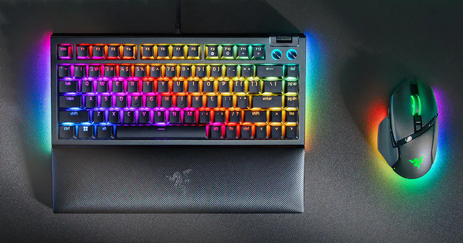 Es un teclado de 75% de tamaño: incluye la fila de funciones (F1-F12) y las flechas, Supr, etc., pero comprime el diseño para ahorrar espacio (no tiene pad numérico). La construcción es de primera: marco superior de aluminio, base de plástico robusto, y en su interior Razer incorporó múltiples capas de espuma y cinta (poron gaskets, foam entre placa y PCB, y hasta un tape mod de fábrica) para lograr un sonido sólido y apagado al teclear. Este es exactamente el tipo de mods que la comunidad hace manualmente, pero ya viene hecho de fábrica. También incluye estabilizadores de tecla (espacio, Enter, Shift) prelubricados y montados en placa que evitan ruidos de rattle. Todo esto resulta en una experiencia de tecleo muy silenciosa y agradable, inusual en un teclado gamer comercial. En rendimiento, soporta Polling Rate de 8000 Hz, poniendo su latencia al nivel top (Rtings midió una consistencia excelente, aprovechando esa alta tasa de sondeo). Trae una memoria interna para hasta 5 perfiles personalizables. La iluminación es Razer Chroma RGB por tecla, personalizable en Synapse y sincronizable con ecosistema Razer. Un plus físico es que incluye un reposamuñecas magnético acolchado en polipiel muy cómodo – algo que muchos teclados compactos omiten. También tiene un interruptor de modo (juego/oficina) para cambiar de perfil y desactivar tecla Windows, etc.
