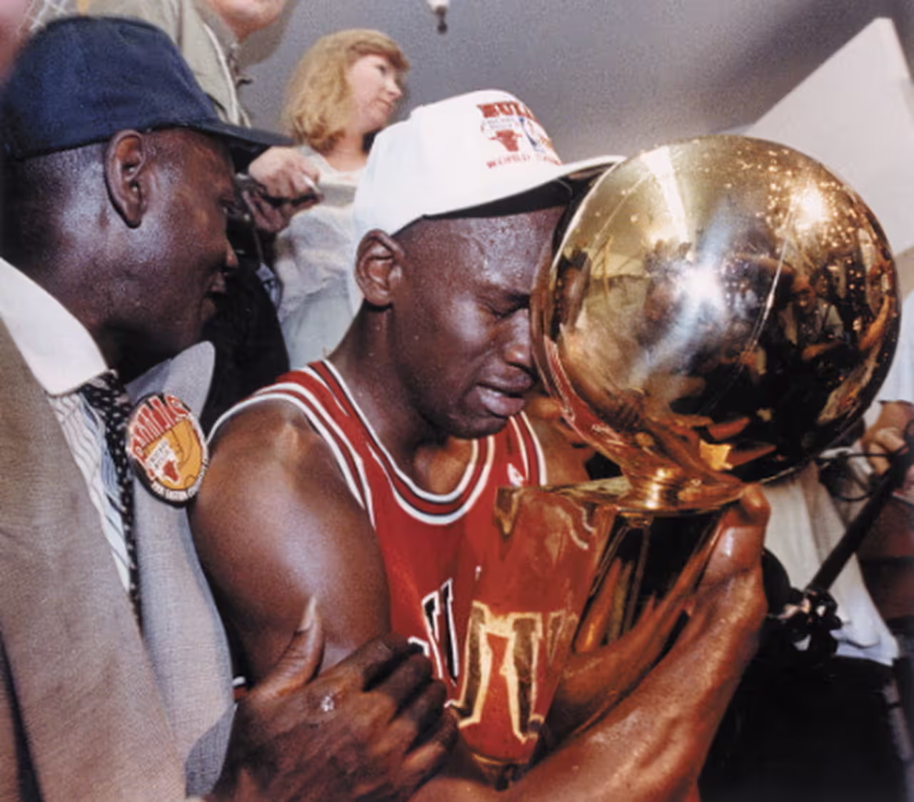 En 1991, los Bulls vencieron a los Pistons y luego ganaron el campeonato. Jordan lloró al abrazar el trofeo. Era su primer título, pero más que eso, era la validación de todo el trabajo que había hecho en silencio.