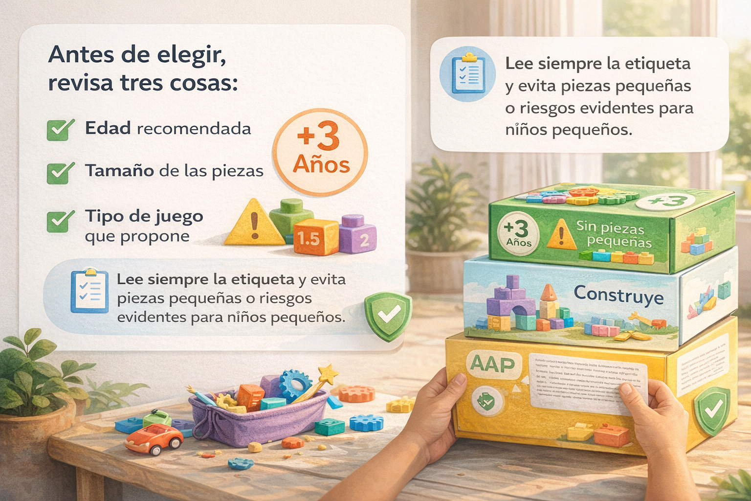 Antes de elegir, revisa tres cosas: la edad recomendada, el tamaño de las piezas y el tipo de juego que propone. Si el juguete invita a imaginar, crear, construir, moverse o repetir la actividad muchas veces, normalmente vas bien. Si además es resistente, seguro y apropiado para su etapa, mejor todavía. La AAP recomienda leer siempre la etiqueta y evitar juguetes con partes pequeñas o riesgos evidentes para niños pequeños.