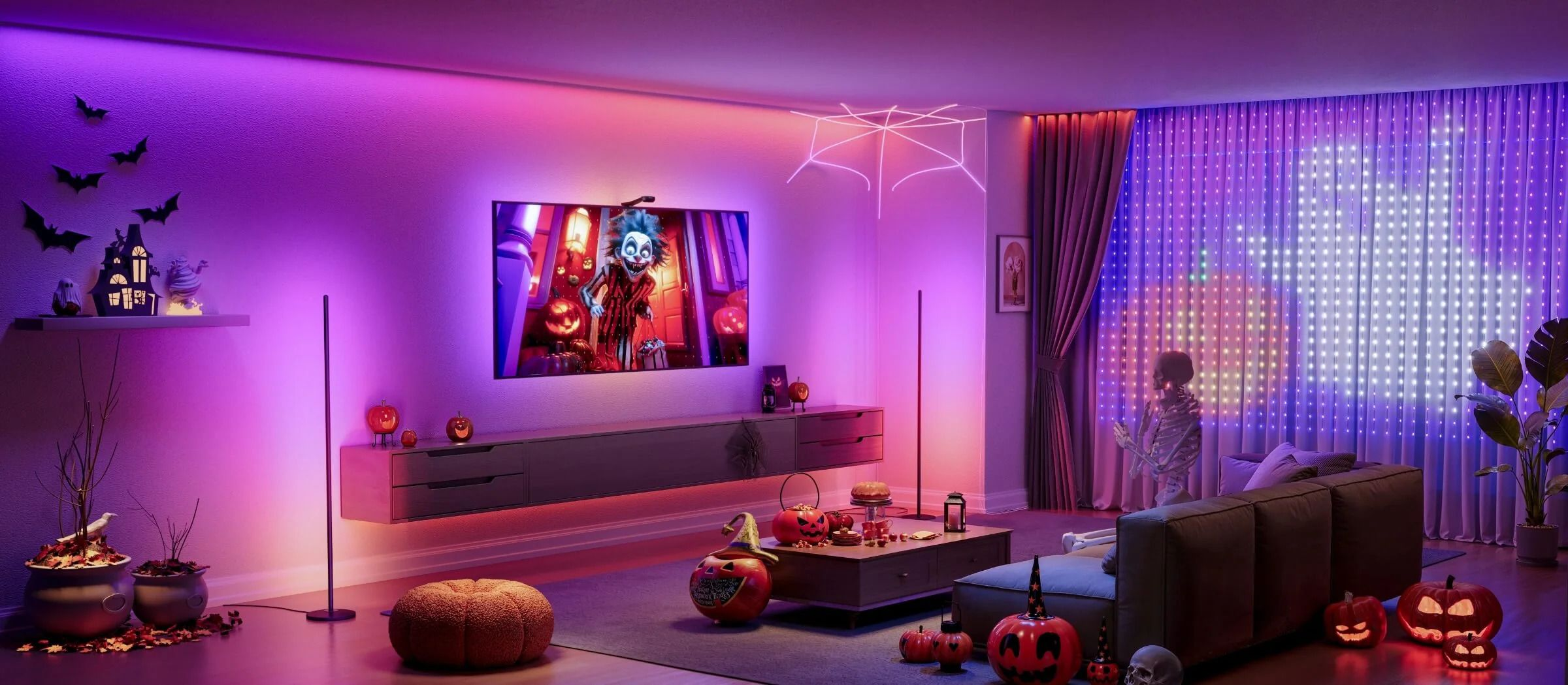 La iluminación es la clave para crear una atmósfera verdaderamente escalofriante. Las luces inteligentes te permiten ajustar la intensidad, los colores y los efectos con precisión. No se trata solo de bajarle el brillo, sino de jugar con los tonos de la temporada —como verdes, morados y rojos— que transforman por completo el espacio. Con Philips Hue, por ejemplo, puedes activar escenas temáticas de Halloween desde la galería de su app o descargar HueDynamic, que ofrece efectos animados como relámpagos o pulsos “undead”. En el caso de Govee, su sección “Festival” incluye animaciones exclusivas para esta época.